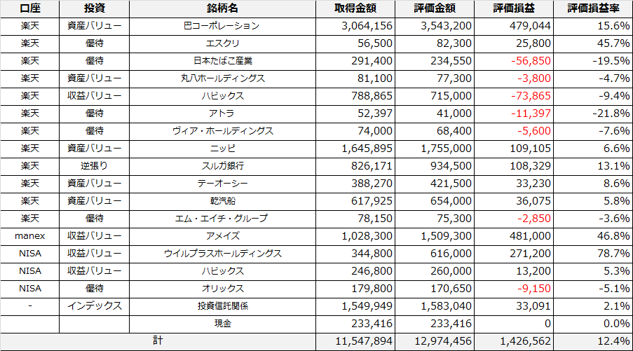 2019年9月13日時点株式評価損益 サラリーマンのバリュー投資日記